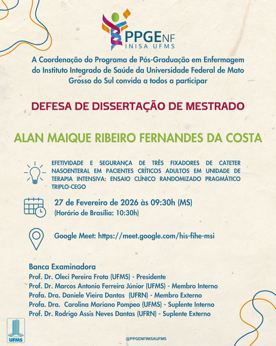 Defesa de Dissertação do trabalho intitulado “EFETIVIDADE E SEGURANÇA DE TRÊS FIXADORES DE CATETER NASOENTERAL EM PACIENTES CRÍTICOS ADULTOS EM UNIDADE DE TERAPIA INTENSIVA: ENSAIO CLÍNICO RANDOMIZADO PRAGMÁTICO TRIPLO-CEGO”, do aluno ALAN MAIQUE RIBEIRO FERNANDES DA COSTA.