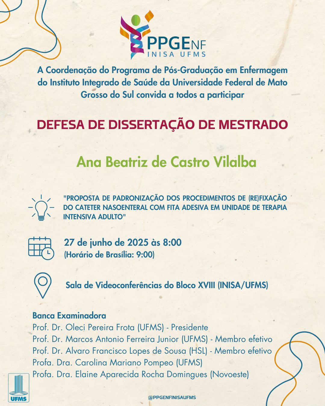 Convite – Defesa de Dissertação do trabalho intitulado “PROPOSTA DE PADRONIZAÇÃO DOS PROCEDIMENTOS DE (RE)FIXAÇÃO DO CATETER NASOENTERAL COM FITA ADESIVA EM UNIDADE DE TERAPIA INTENSIVA ADULTO”, da aluna Ana Beatriz de Castro Vilalba.